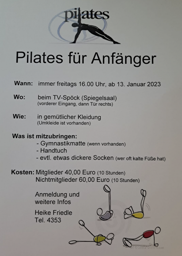 Ab dem 13.01.2023 startet ein neuer Pilates-Kurs für Anfänger, der immer Freitags von 16.00 Uhr bis 17.00 Uhr stattfindet.